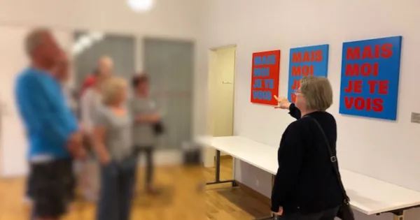 Det blir dialog runt motivet som är målat av konstnären Primus Mortimer Pettersson. Kanske kan det vara ett varmt ställe i Spanien, eller kan det vara Australien som porträtteras, idéerna är många. När tavlan har diskuterats en stund är det dags för deltagarna att själva fatta tag i penslarna. Stora vita papper sprids ut över ett bord och akvarellfärger ställs fram.