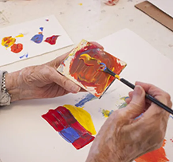 Stora droppliknande former i klara färger; blått, lila, rosa, gult och orange breder ut sig över ytan. Längs med den glasade fasaden i anslutning till huvudentrén har Astrid Sylwan arbetat fram en 35 meter lång målning. Inspirationen kommer från persisk keramik och klassiska former som kärl och pelare.