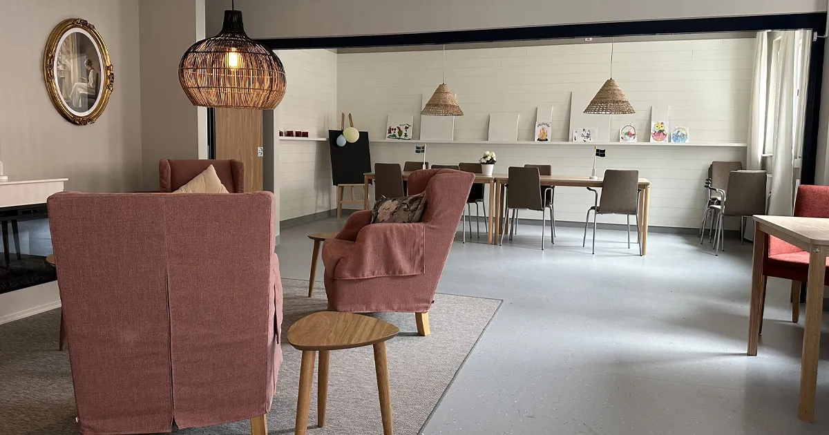Varje lägenhetsgrupp har gemensamma utrymmen som vardagsrum, kök och matsal.